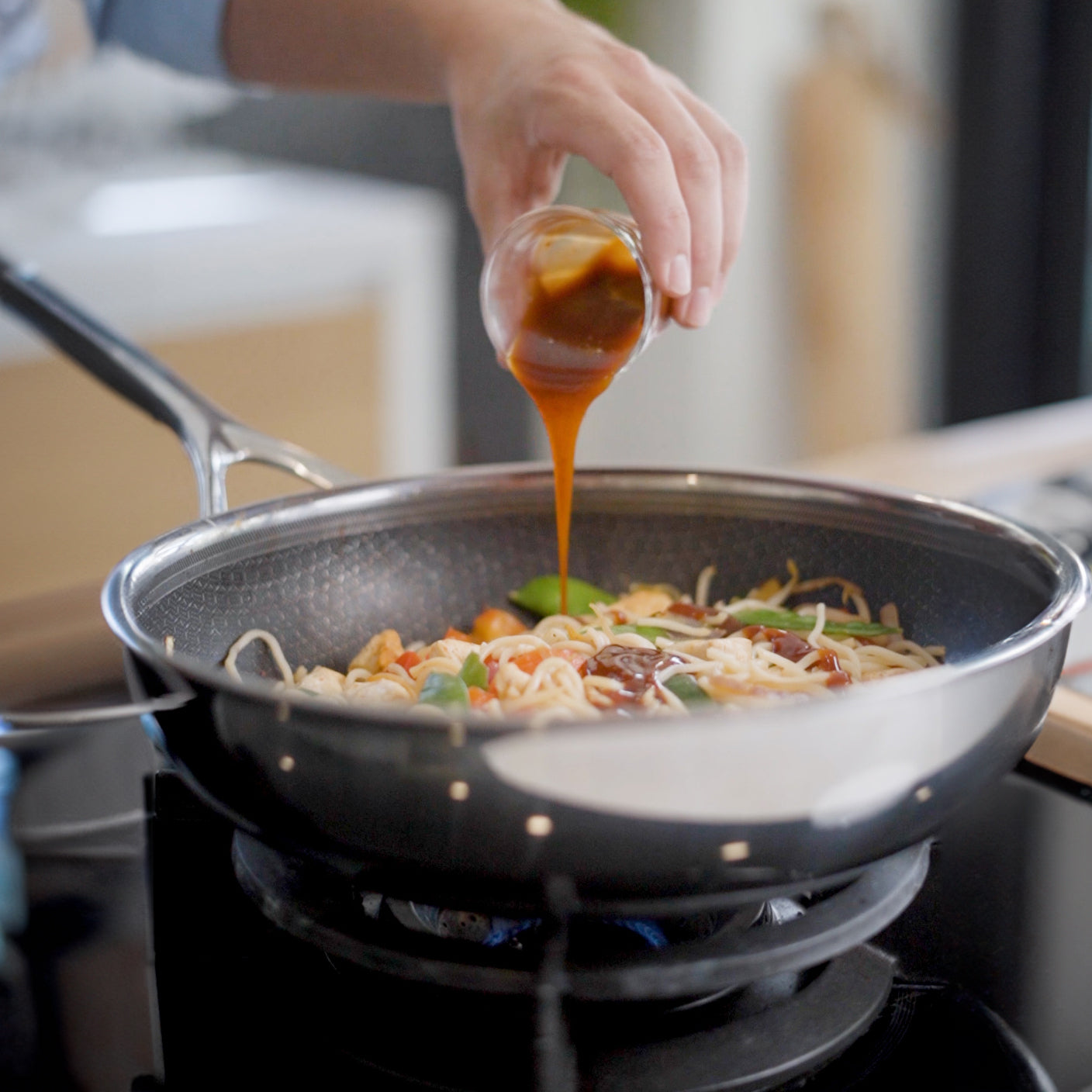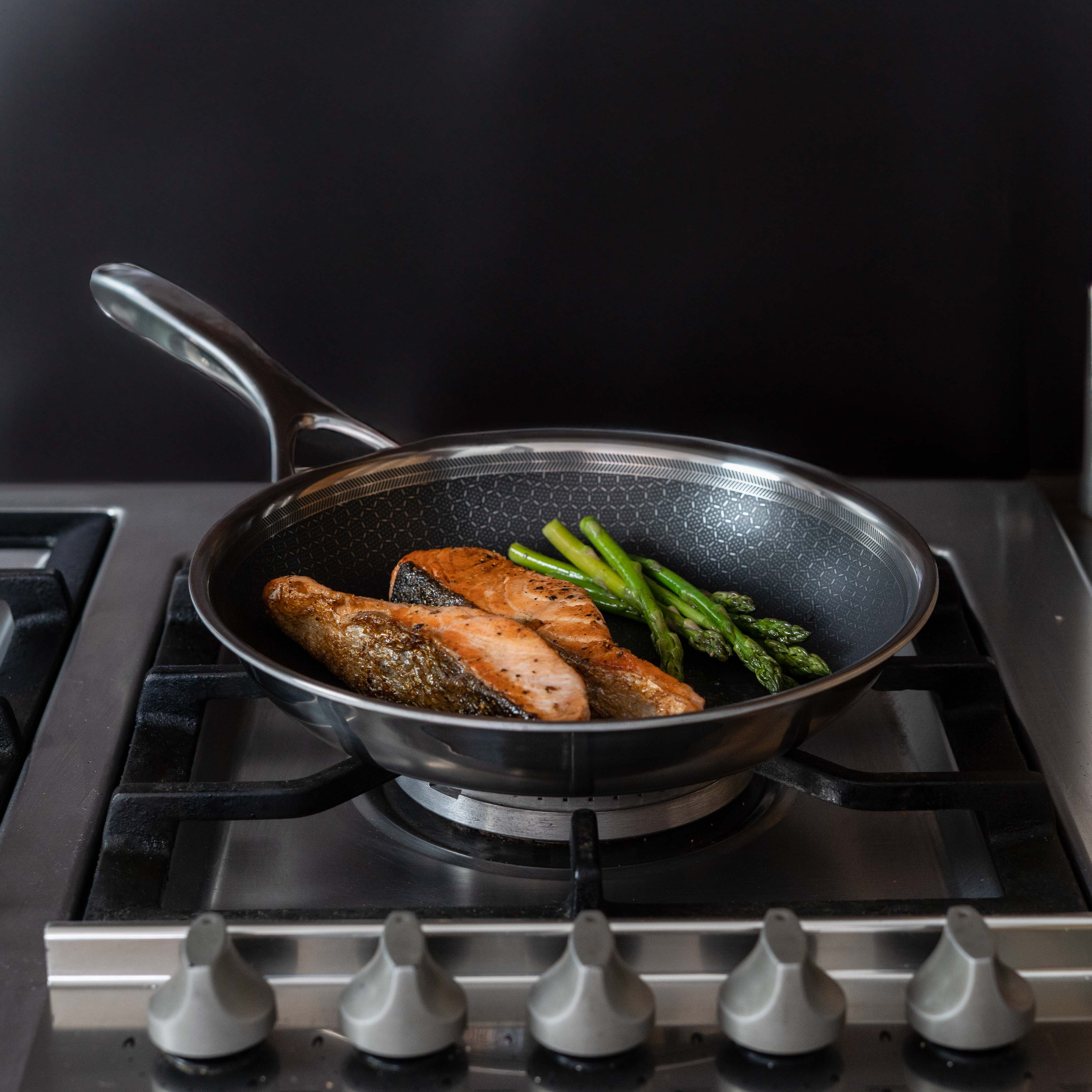 This technology makes the pan not only ideal for intensive use, but also for various cooking techniques – from roasting and baking to sautéing and flambéing. The hybrid pan is perfect for preparing healthy dishes with less fat, and the combination of materials makes the pan extra resistant to wear and high temperatures.